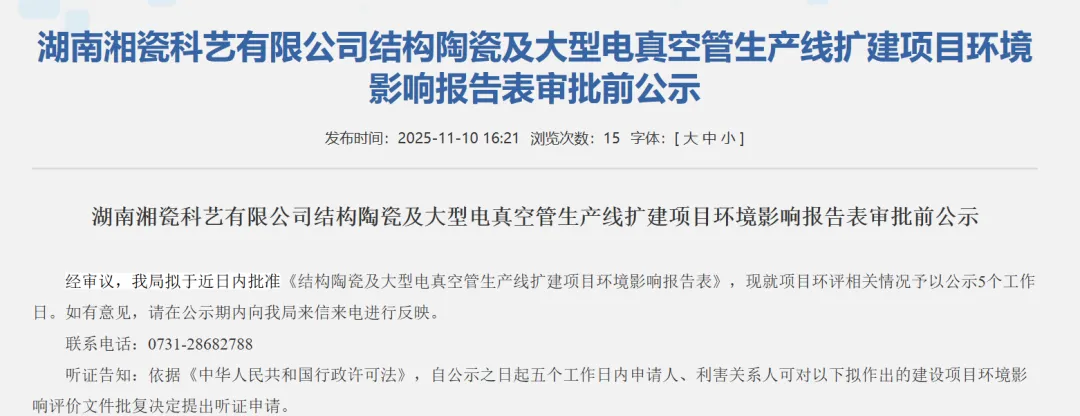 2025-11-1411月10日,株洲市天元区人民政府发布了结构陶瓷及大型电真空管生产线扩建项目环评批前公示。项目名称:结构陶瓷及大型电真空管生产线扩建项目建设单位:湖南湘瓷科艺有限公司建设地点:湖南省株...